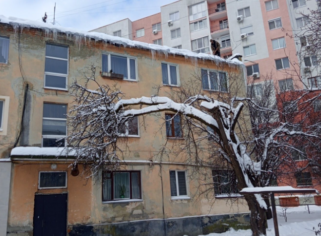 Через погодні умови на дахах утворилися бурулі, які звисають і можуть впасти. У зв’язку з цим комунальники проводять очистку дахів та застерігають пішоходів бути обережними, проходячи повз будівлі.