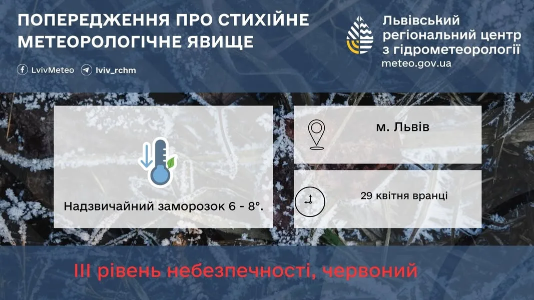 Львівський регіональний центр з гідрометеорології оприлюднив офіційне попередження про небезпечне метеорологічне явище. Вранці 29 квітня на території Львівської області та у Львові прогнозуються надзвичайні заморозки з температурою повітря в межах від −6 до −8 °C. Це відповідає ІІІ рівню небезпечності (червоний).