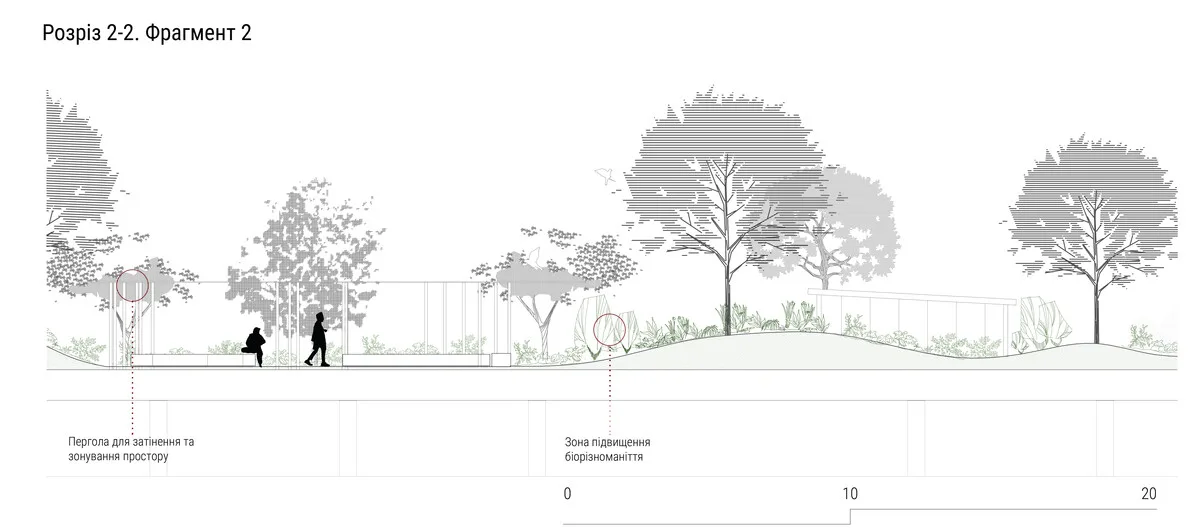Уривом до проєкту передбачено системи водовідведення, дощові сади та інші елементи для підтримки ландшафтної архітектури, що має забезпечити стійку та якісну інфраструктуру в урбаністичному середовищі. Архітекторка Ольга Криворучко підкреслила, що пішохідна зона проекту враховуватиме інклюзивність ідентичність місця та пам’ять міської тканини.