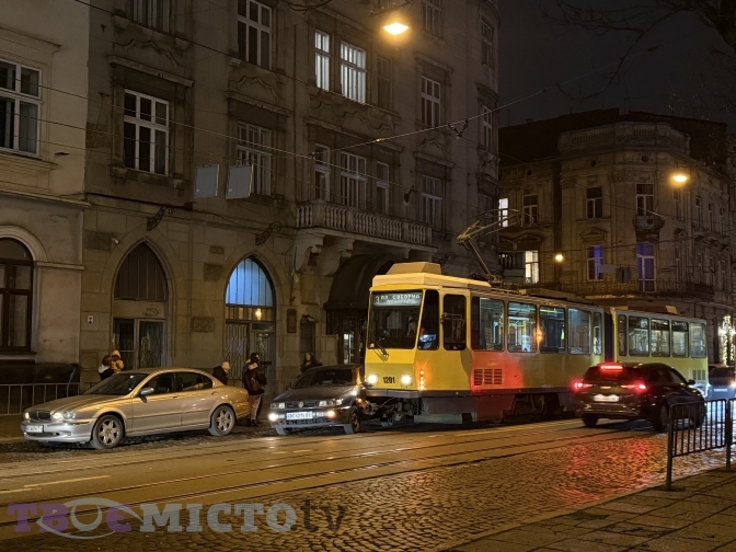У центрі Львова, перед поворотом на кінцеву трамвайну зупинку на площі Соборній, відбулась ДТП між автомобілем і трамваєм.